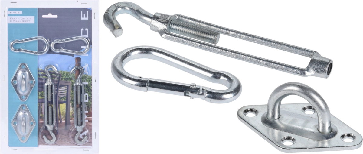 Met deze set hangt u uw schaduwdoek eenvoudig en snel op. Deze set bestaat uit twee metalen karabijnhaken, twee metalen ogen op een plaat en twee metalen spanwartels.