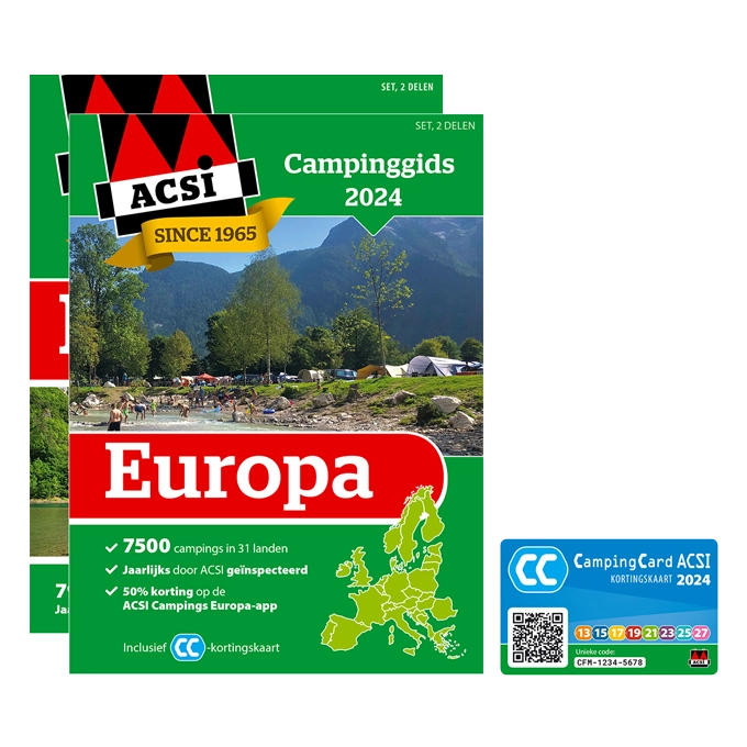 Met de ACSI Campinggids Europa 2024 vindt u snel en gemakkelijk een camping die bij u past. De gids bevat informatie over 7.500 campings in 31 landen binnen Europa, handig dus voor onderweg of als voorbereiding. De campings worden door ACSI jaarlijks gecontroleerd op meer dan 200 voorzieningen, waardoor u er op kunt vertrouwen dat de informatie in de ACSI Campinggids Europa 2024 actueel is. Met CampingCard ACSI-kortingskaart verblijft u in het laagseizoen altijd voor een voordelig tarief op meer dan 3.00 campings. Bij bestelling van de ACSI Campinggids Europa 2024 ontvangt u de twee-delige gids, kaart met doorreiscampings, CampingCard ACSI-kortingskaart 2024 (t.w.v. € 21,95) en een voucher voor 50% korting op één jaar toegang tot alle campinginformatie in de ACSI Campings Europa-app.