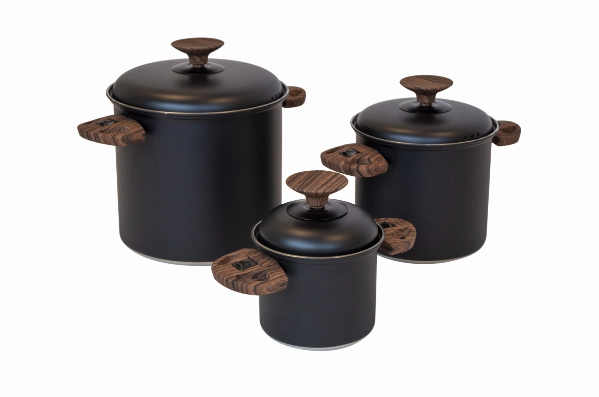 Een industriele 3-delige RVS pannenset uit de Industrial collectie van Bo-Camp. Iedere pan beschikt over een RVS deksel met hittebestendige knop. Door het zwarte stainless steel en de houtlook knoppen hebben ze een industriele uitstraling. Daarnaast heeft iedere pan hittebestendige en wegklapbare handgrepen. Deze handgrepen kunnen na gebruik eenvoudig om worden geklapt zodat de pannen volledig nestbaar en compact op te bergen zijn. Bespaart tot 40% ruimte! De pannen zijn smal en hoog en daardoor bij uitstek geschikt voor de beperkte ruimte op gaskomforen. Te gebruiken op de warmtebronnen gas, keramisch en elektrisch. Afmetingen (Øxh): 12x11, 16x15 en 20x19 cm. Afmetingen genest (Øxh): 20x19 cm. Inhoud: 1,2, 3 en 6 liter.