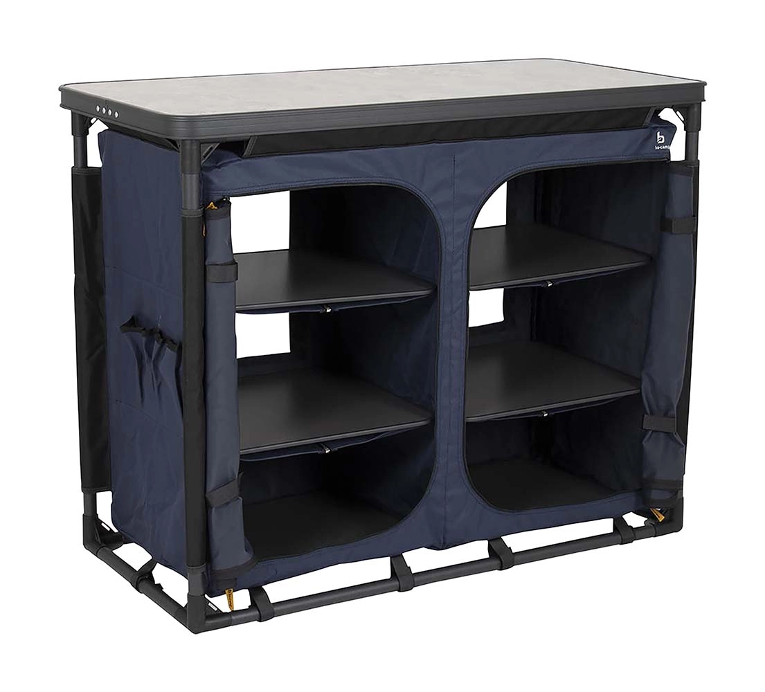Het Bo-Camp Hubbard kookeiland is een stijlvol kookmeubel dat onderdeel uit maakt uit de industrial collectie. De campingkeuken is gemaakt van een extra stevige donker blauwe polyester hoes met daarin 6 legplanken. U heeft buiten het gaskomfoor nog meer dan genoeg ruimte over voor bijvoorbeeld het snijden of voorbereiden van ingredienten. De kast heeft verstelbare poten zodat hij op elke ondergrond stevig staat. Het meubel is compact op te vouwen tot een dikte van slechts 11,5 centimeter, weegt door het aluminium frame maar 11,5 kg én wordt geleverd met handige draagtas.