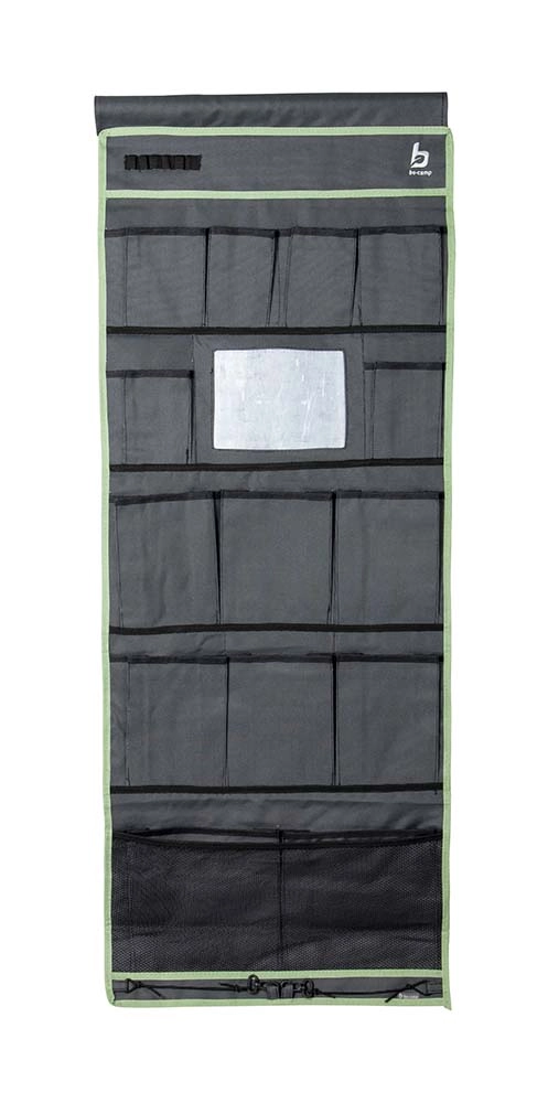 Deze mooie multifunctionele 15-vaks organizer / tentschort met spiegel van Bo-Camp is gemaakt van een hoge kwaliteit 600D Oxford polyester. De organiser beschikt over 2 ruime vakken, 6 medium vakken, 6 kleine vakken, 1 netzak en een spiegel. Het tentschort is eenvoudig en op diverse manieren te bevestigen. Zo kan dit tentschort met de pees worden opgehangen aan een caravanrails, met het klittenband aan een tentstok of met de zeilogen aan haken. De lussen onderaan het tentschort zorgen voor extra fixatie.Specificaties: