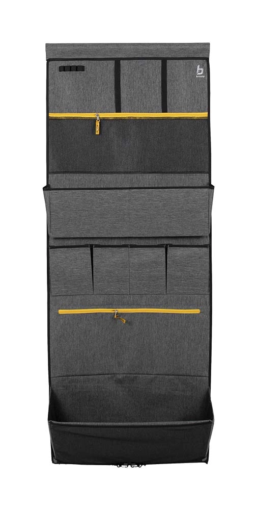 Het Bo-camp Industrial tentschort overton large is een multifunctionele 9-vaks organizer. De organizer heeft 1 XXL vak, 2 extra grote vakken met rits, 2 grote vakken en 4 medium vakken. Het XXL vak heeft nog een extra opbergruimte doormiddel van het net dat ervoor zit. Daarnaast heeft het tentschort ook 2 elastieken aan de bovenkant waar spullen in opgeslagen of aan vastgemaakt kunnen worden. Allerlaatst heeft het tentvak een pennenhouder. Het tentschort is eenvoudig en op meerdere manieren te bevestigen. De organizer kan met de pees worden opgehangen aan een caravanrails, met het klittenband aan een tentstok of met zeilogen aan haken. Lussen onder aan het tentschort bieden een mogelijkheid voor extra fixatie.