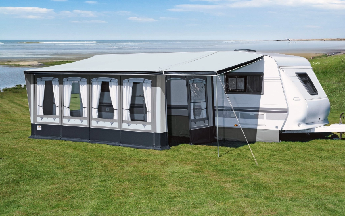 De Forum deeltent is door zijn specifieke constructie geschikt voor gebruik in alle 4 seizoenen. Het speciale frame zorgt voor een zeer stabiele constructie en de vorm van het dak zorgt voor een perfecte afloop van water en is zelfs geschikt om sneeuwlast te dragen. De Forum kan of links (aan de achterzijde) of rechts (disselzijde) worden ingetrokken. Afhankelijk van de omstandigheden ter plaatse en de lengte van de caravan kan hier de meest optimale variant worden bepaald. De elementen in de voorwand en in de zijwand kunnen allemaal met elkaar uitgewisseld worden. De Forum heeft standaard raamelementen met blindering, een recht oprolbare deur en een klimaatraam. Dit 3-delige ventilatiepaneel kan evenals de ronde deur zowel in de zijwand als in de voorwand geplaatst worden. Dit biedt 100% keuzevrijheid in indeling en gebruik van de voortent. Alle ramen voorzien van gordijnen en raamblindering met ritsen. Het dakmateriaal van de Forum is vervaardigd van het hoogwaardige PVC Polyestercoating 550 grams. Deze zware kwaliteit is speciaal ontwikkeld voor 4- seizoensgebruik, is duurzaam, oersterk en is eenvoudig schoon te maken. Het dak is uit 1 stuk, dat wil zeggen zonder naad. De wanden zijn gemaakt van TenCate All Season 240 grams tentdoek, afwasbaar en vochtregulerend eenzijdig gecoat tentdoek. Het materiaal van dak en zijwanden is makkelijk schoon te maken zowel aan de binnen als aan de buitenzijde door de dubbelzijdige PVC coating. Hardnekkige vuilaanslag en “het weer“ (schimmelaanslag) zijn eenvoudig te verwijderen met een natte doek. Door de toepassing van PVC in dak en zijwanden is deze voortent ook geschikt om op een vaste jaarplaats het hele jaar door te gebruiken. Het materiaal is goed bestand tegen de vaak langdurige vochtige periodes in de herfst en winter. Tijdens het gebruik in de winter adviseren wij wel extra dak ondersteuning in verband met mogelijke sneeuwlast.
