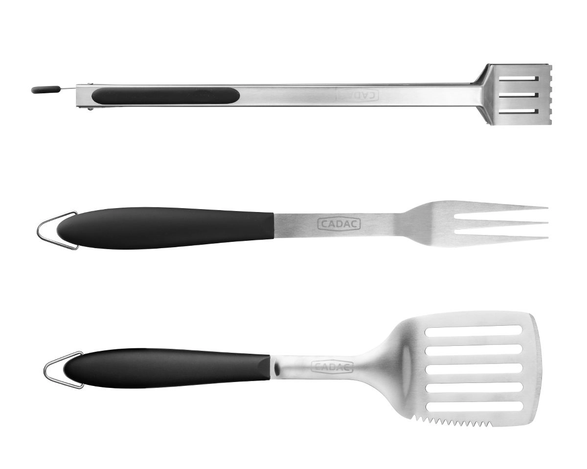 Deze driedelige set van Cadac bestaat uit een spatel, een vork en een tang. Dit robuuste en handige barbecue gereedschap is gemaakt van een hoge kwaliteit RVS. Het gereedschap is voorzien van een stevige zachte handgreep voor extra comfort en beschikt over handige ophanghaakjes.