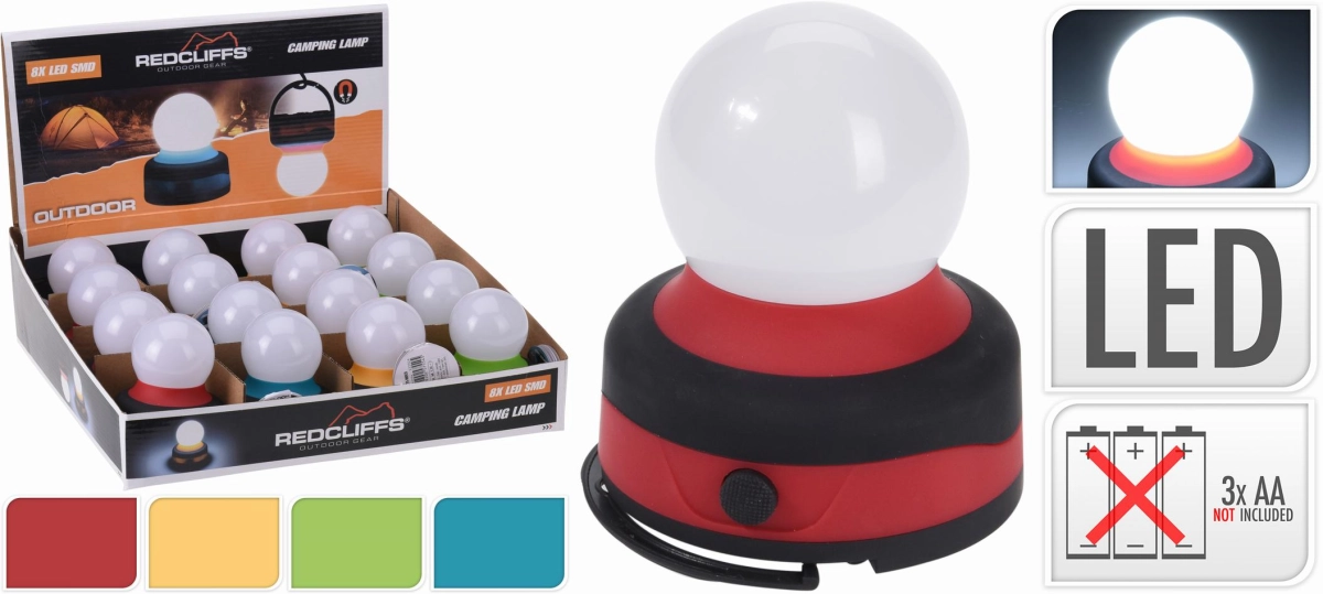 Een handige energiezuinige LED lamp voor in uw voortent of onder de luifel. De lamp is zowel hangend als staand te gebruiken, beschikt over een magneet aan de onderkant en werkt op 3 AA batterijen (niet meegeleverd). De LED lamp is voorzien van een aan/uit schakelaar.
