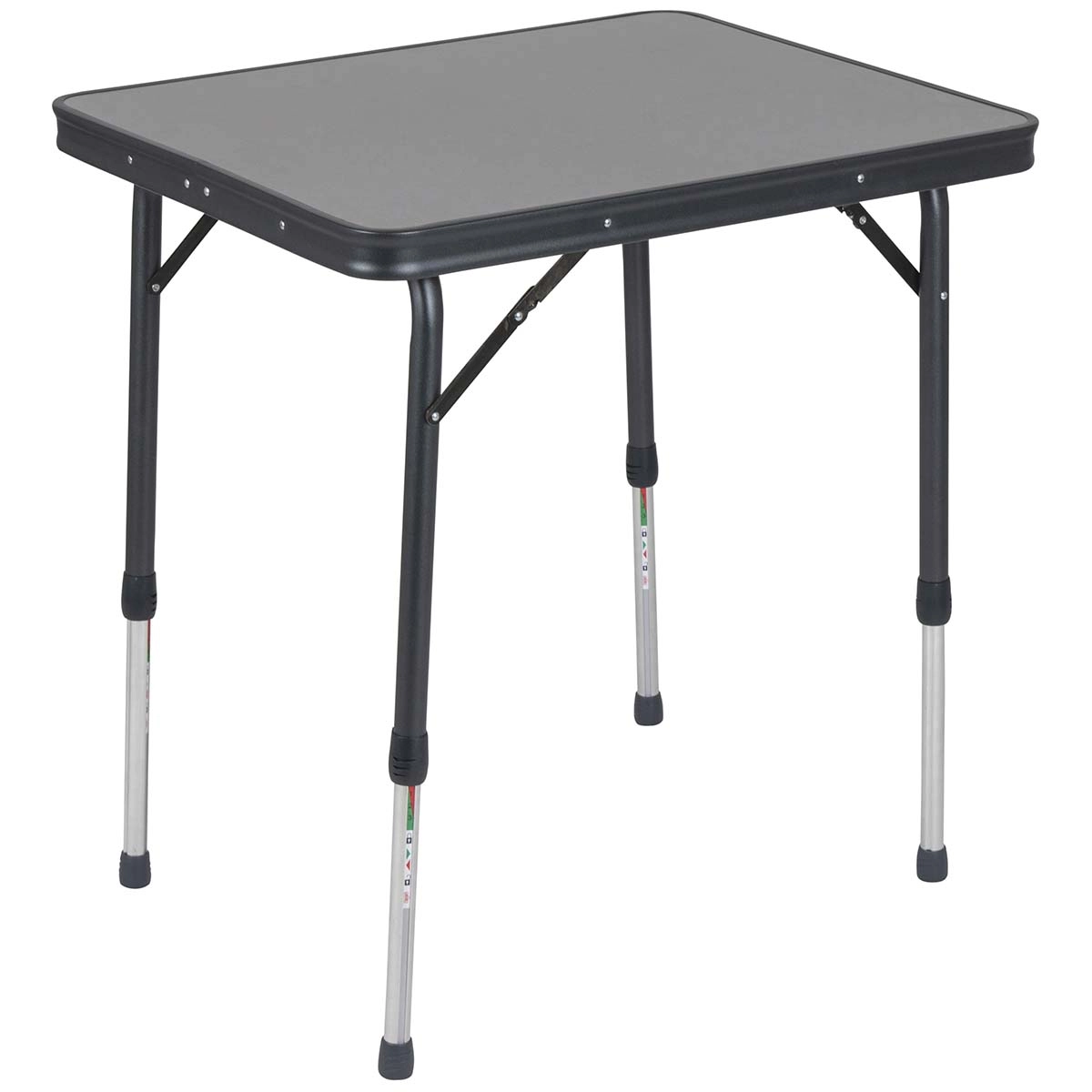 Deze lichte en stabiele campingtafel heeft een hittebestendig en watervast tafelblad en is uitgerust met een aluminium frame en stijlvolle grijze poten. De traploos verstelbare poten (47-69 cm) kunnen worden ingeklapt, waardoor de tafel compact en makkelijk te vervoeren is.