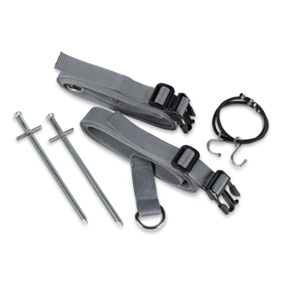 Met deze stormbandenset van Kampa Dometic zet u uw voortent gemakkelijk stevig vast zodat deze beter bestand is tegen harde wind. De banden zijn te bevestigen op de standaard bevestigingspunten van een Kampa voortent. De stormbandenset wordt geleverd met twee grote haringen.