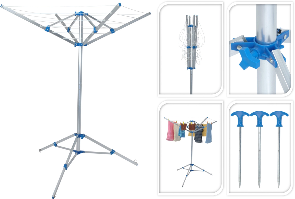 Deze inklapbare droogmolen van Bo-Camp is ideaal voor het drogen van je was in de buitenlucht. Dankzij het compacte ontwerp is hij eenvoudig mee te nemen op reis. De droogmolen wordt geleverd met drie grondpennen, zodat hij stevig verankerd kan worden op gras of zand. Perfect voor op de camping of in de tuin.
