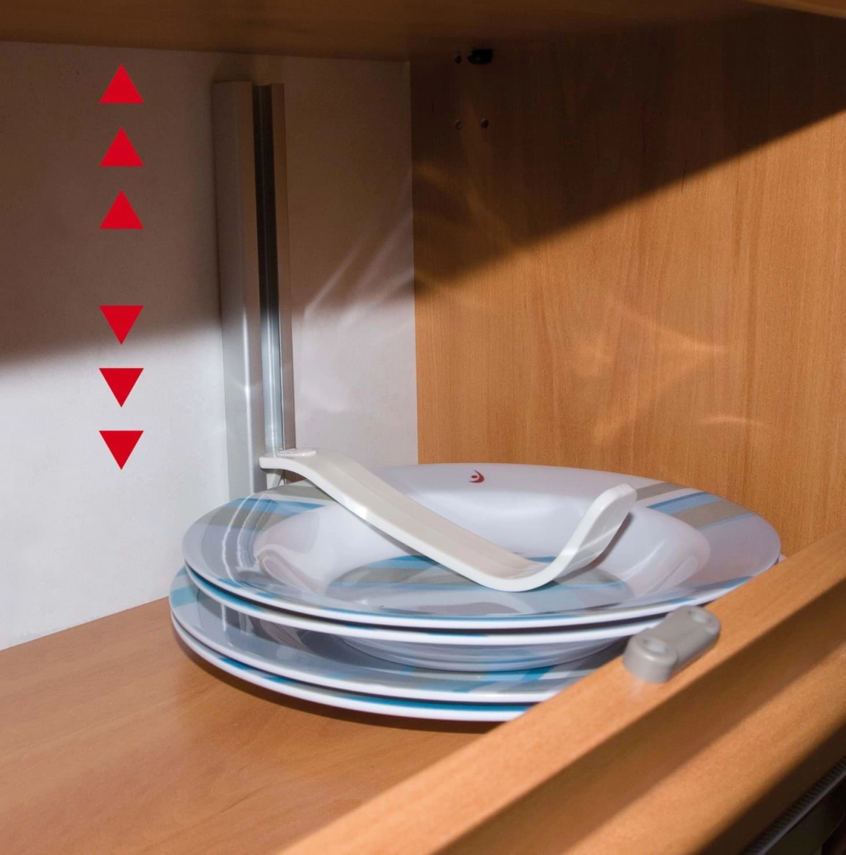 Fiamma heeft een handige oplossing bedacht tegen het rammelen en schuiven van uw borden tijdens de reis. De Omni stop wordt tegen een wand gemonteerd en de lepel is in hoogte verstelbaar, om zo de borden ferm tegen de bodem van het keukenkastje te klemmen. De speciale vorm van de lepel maakt het mogelijk om alle soorten borden er in te klemmen. De wandsteun is 25 centimeter lang en gemaakt van geanodiseerd aluminium. De lepel die op de borden rust is gemaakt van kunststof en is 20 centimeter lang.