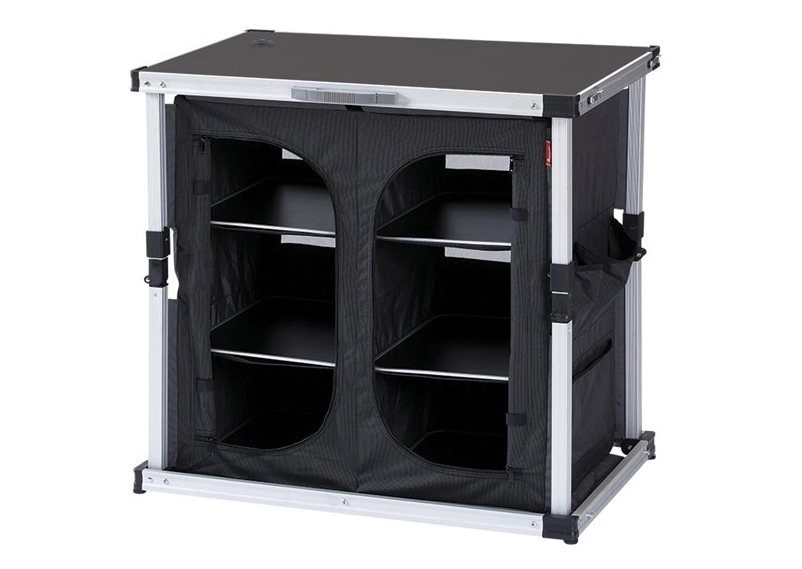 De 4 poten ”knikken” in het beslag en worden bij het in elkaar klappen samengevouwen in de campingkast. De kast, door de breedte ook te gebruiken als kookeiland, wordt geleverd inclusief een handige opbergtas en is voorbereid voor een stekkertoren en een oplaadplaat.