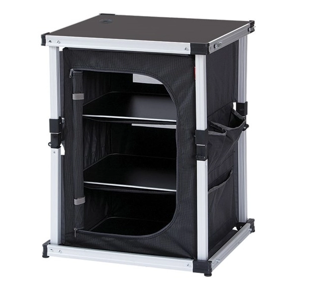 De 4 poten ”knikken” in het beslag en worden bij het in elkaar klappen samengevouwen in de campingkast. Hierdoor neemt de campingkast tijdens transport een minimum aan ruimte in. De praktische en stabiele Isabella Campingkast Enkel heeft 3 schappen en een vaste bovenplaat. Om de campingkast makkelijk te kunnen transporteren is deze voorzien van een twee handvatten en krijg je er een handige transporttas bij. Het model 2018 is voorzien van een voorbereiding waarin de Isabella stekkertoren 900060461 gemonteerd kan worden.
