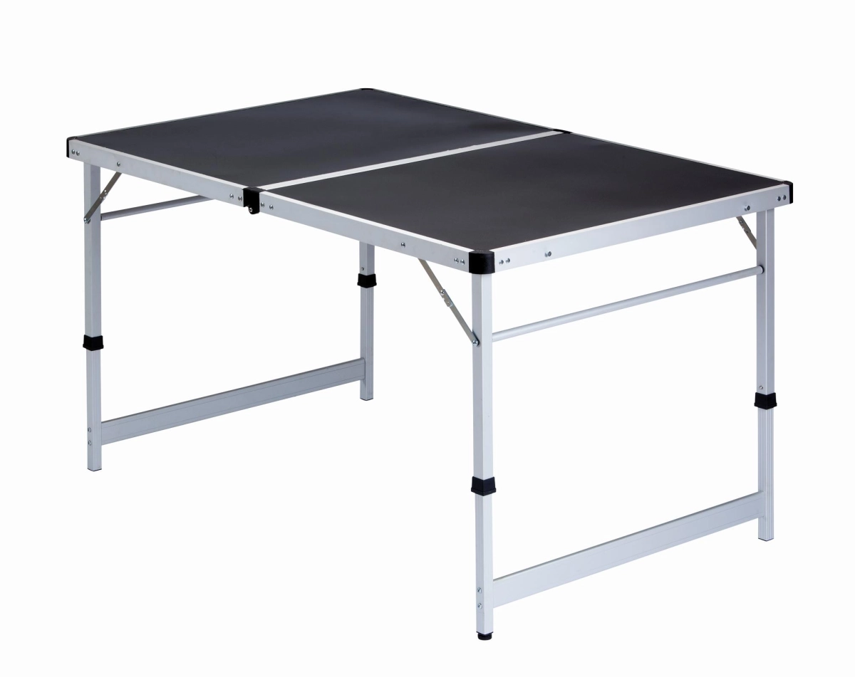De kampeertafel heeft een aluminium frame met 1 verstelbare poot. Om de kampeertafel gemakkelijk te kunnen transporteren is deze voorzien van een twee handvatten.