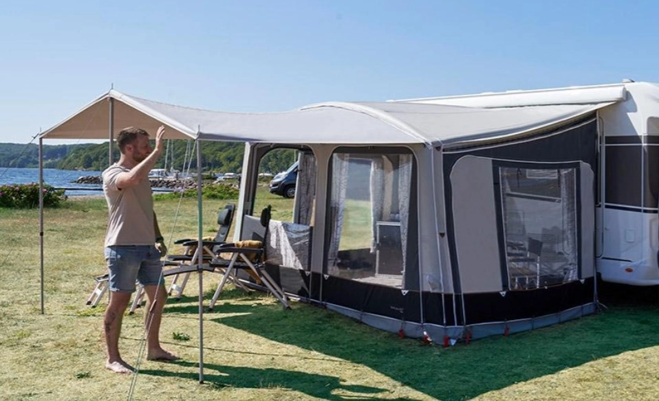 Als je extra schaduw nodig hebt voor je Ventura AIR Dove luifel, is deze lichtgewicht luifel een gemakkelijke oplossing. Hij wordt bevestigd met een rits en drie lichtgewicht glasvezelstokken. Ventura AIR Dove is ontwikkeld om heel gemakkelijk je woonruimte uit te breiden tijdens je kampeervakantie. De opblaasbare voortent is geproduceerd in Europa en door het gebruik van kwaliteitsmaterialen heb je een onderhoudsvriendelijke voortent die lang meegaat en veel comfort biedt. Front en zijkanten zijn afneembaar voor een goede luchtcirculatie op warme zomerdagen. Door de luchtkanalen is de voortent gemakkelijk op te zetten en af te breken. Je pompt gewoon op één plek de lucht erin en je tent is in no-time klaar voor gebruik. Om bij Dove te zorgen voor een nauwsluitende pasvorm en afdichting tegen je caravan of je voertuig krijg je er een schuimkussen en zuignappen bij waarmee je regen en wind tegenhoudt. Dove is voorzien van een uniek systeem voor hoogteverstelling waarmee de opblaasbare voortent op verschillende hoogtes kan worden ingesteld. Hij is daarom geschikt voor zowel caravans als kampeerauto's met een railhoogte van 245 tot 270 cm.