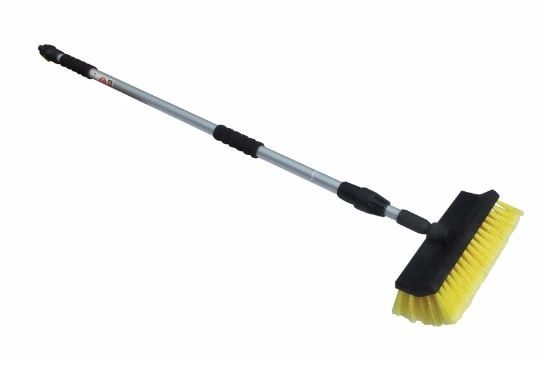 Deze telescopische wasborstel heeft een lengte van 2.5 meter, hierdoor kun je ook boven aan de caravan of camper goed schoonmaken.