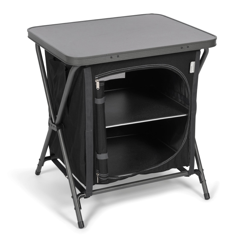 De kast is eenvoudig en snel op te zetten, zodat u snel al uw kampeerartikelen kunt opbergen. De kast is compact en lichtgewicht, maar tegelijkertijd ook stevig en voorzien van twee legplanken en een tafelblad.