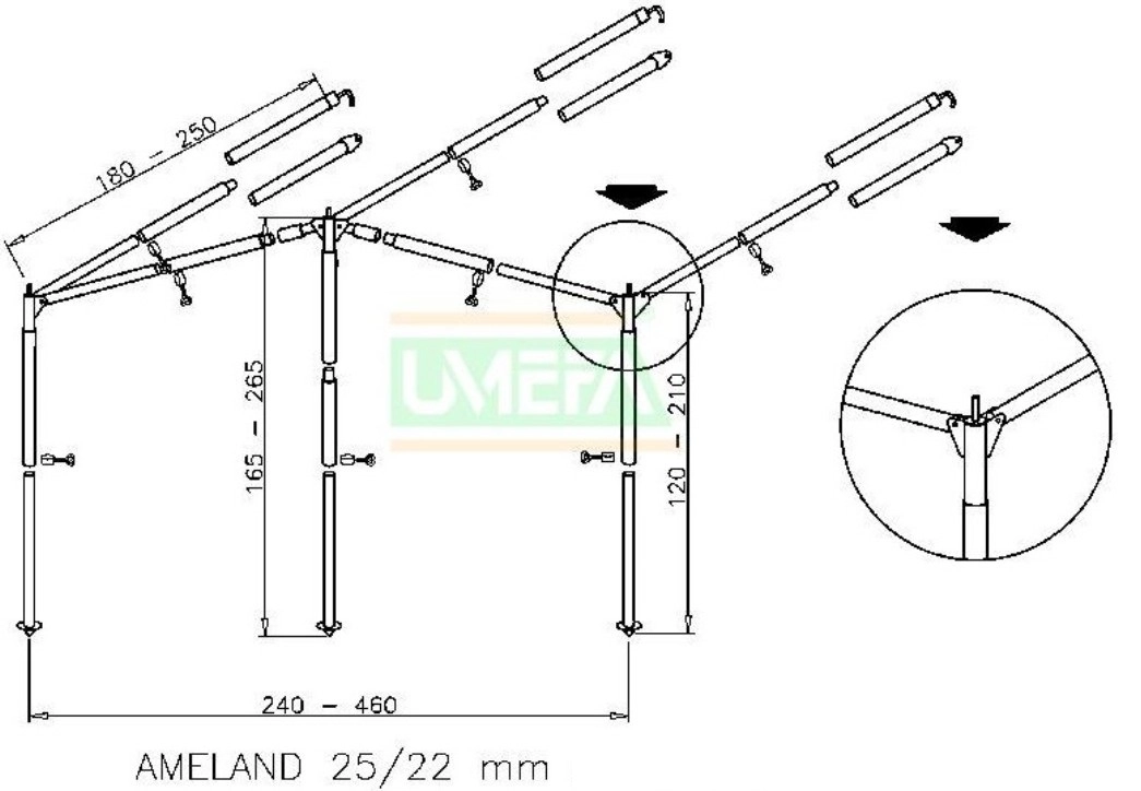 Het Luifelframe ameland is een universeel frame voor uw zonneluifel. Met een verstelbare breedte maat van 2.40 tot 6.40 meter en een verstelbare diepte van 1,80 tot 2,50 meter, kan u hier vrijwel altijd mee uit de voeten. Ook de hoogte is verstelbaar van 1,20 tot 2.10 meter met een nokhoogte van 2.65 meter. Hierdoor zijn ook vrijwel alle luifels met zijwanden netjes op te spannen.