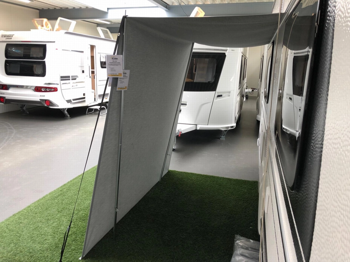 Een handige luifel voor aan uw caravan om bijvoorbeeld uw fietsen of campeerstoelen onder te plaatsen. De luifel is heel snel opgezet en ook weer opgeruimd. Met behulp van 2 tentstokken (optioneel) en een set spanbanden (optioneel) zet u de luifel stevig vast.