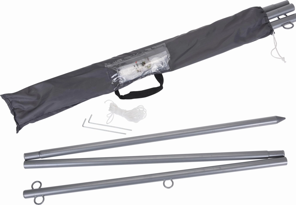 Een 3-delige inklapbare paal, o.a. geschikt voor het bevestigen van een schaduwdoek of tarp. De paal wordt geleverd inclusief een draagtas, scheerlijnen en haringen.