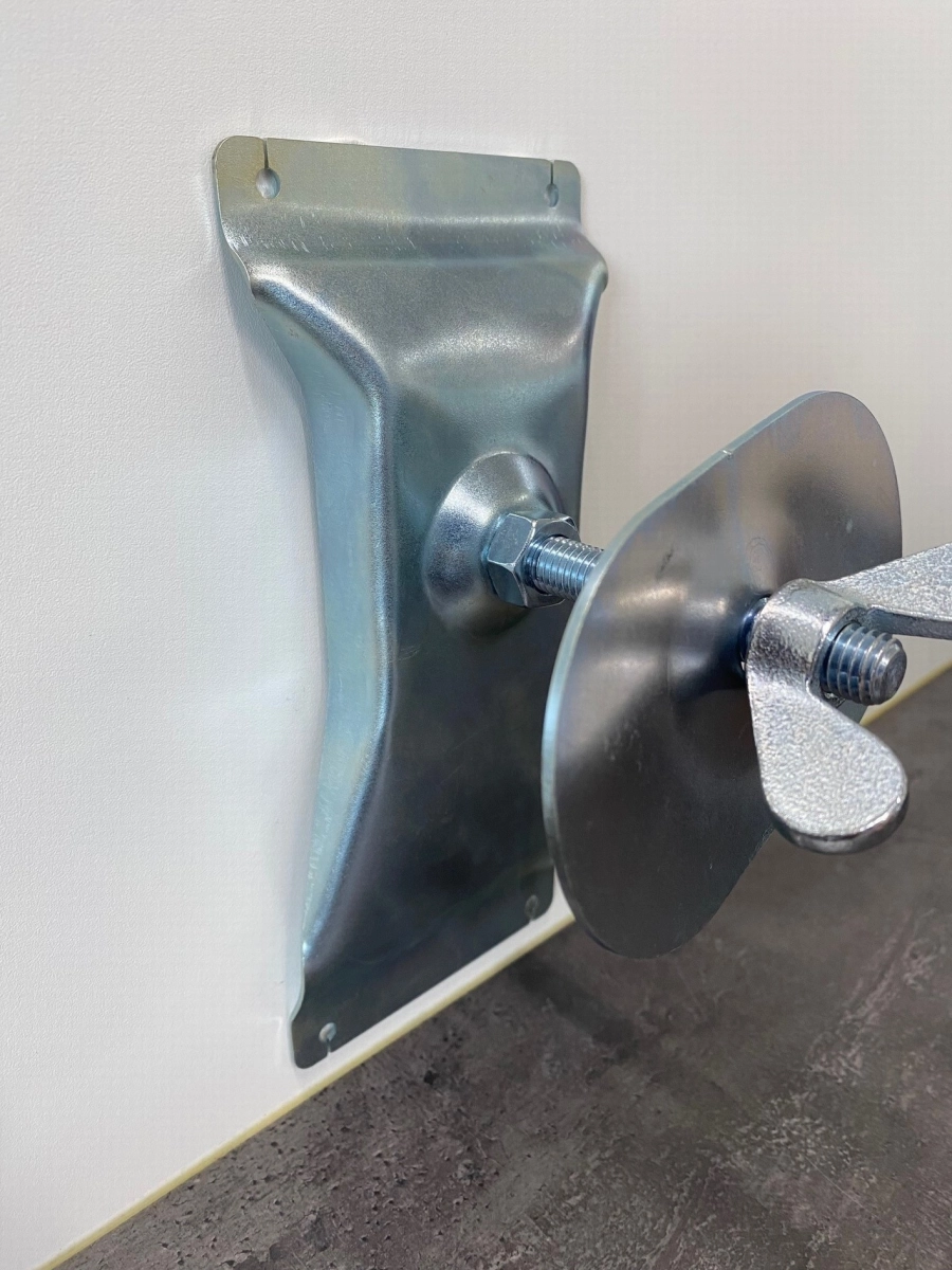 De grote metalen achterplaat monteert u stevig op de achterwand van de disselbak en met de bout bevestigt u het reservewiel.