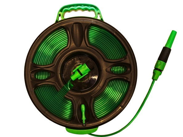 Deze haspel met 15 meter waterslang is ideaal om mee te nemen op vakantie omdat deze haspel bijzonder weinig ruimte inneemt omdat de waterslang plat is. De slang bestaat uit 3 langs elkaar gegoten waterslangen waardoor de slang plat is en zo efficient mogelijk op het haspel gerold kan worden. De waterslang wordt geleverd inclusief spuitmond en kraanaansluitstuk.