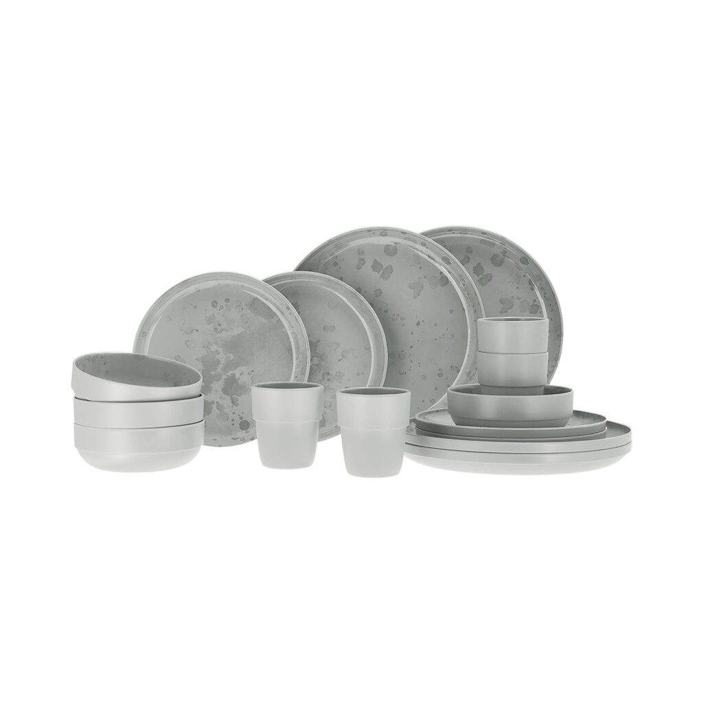 Deze 16-delige set bevat vier bekers (200 ml), vier kommen (ø 13 cm), vier borden (ø 20 cm) en vier borden (ø 25 cm). Hoewel het servies de charme van keramiek heeft, is het vervaardigd van melamine, wat zorgt voor extra stevigheid en duurzaamheid. Dankzij de antislip ring glijdt het servies niet weg, wat het extra veilig maakt voor gebruik op een campingtafel of een andere onstabiele ondergrond.