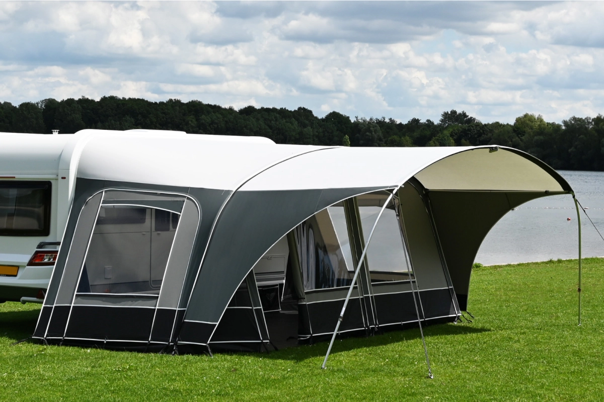 Een optionele dakluifel voorkomt daarnaast inregenen en zorgt er voor dat je optimaal gebruik kunt maken van de ventilatiemogelijkheden in de voortent, zelfs tijdens regenachtige dagen. Veel voortenten en caravanluifels van Unico zijn achteraf uit te breiden met een optionele dakluifel. Deze dakluifel is eenvoudig en snel te bevestigen door middel van een stevige spiraalritssluiting. Aan iedere geschikte voortent of caravanluifel wordt deze rits geplaatst. Zo kun je de dakluifel altijd achteraf aanschaffen en gebruiken zonder dat er aanpassingen aan de voortent of caravanluifel noodzakelijk zijn, wat het proces moeiteloos maakt. De dakluifels zijn vervaardigd uit hetzelfde robuuste Ten Cate All Season tentdoek dat ook in de voortenten van Unico wordt gebruikt. Dit materiaal staat bekend om zijn enorme sterkte, lichte gewicht en vormvastheid. Samen met de stevige, verstelbare aluminium boogstokconstructie en duurzame afspansjorbanden, kunnen zowel de tent als de dakluifel altijd strak worden afgesteld. Dit ontwerp maakt het bovendien mogelijk om optimaal te anticiperen op een ongelijke ondergrond, wat handig is op diverse kampeerlocaties. De ronde vorm van de dakluifel draagt bij aan een uitstekende afwatering, zodat regenwater efficiënt wordt afgevoerd. Dankzij de sterke boogstokconstructie is het vaak mogelijk om de meegeleverde middenstaander niet te plaatsen. Dit resulteert in een ruime overspanning zonder hinder van een grote middenstaander, zodat je optimaal kunt genieten van je ruimte onder de luifel! Afhankelijk van het model wordt de Unico dakluifel geleverd met één of drie dakliggers.