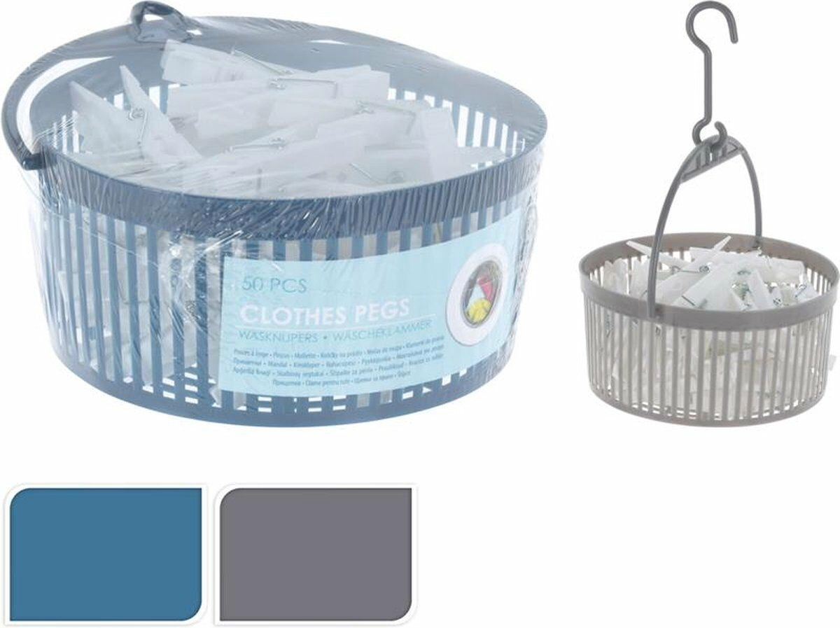 Mandje met 50 stuks wasknijpers. Het mandje beschikt over een hengsel met haak, zodat u hem gemakkelijk aan uw waslijn kunt hangen. Zo heeft u altijd een wasknijper bij de hand.