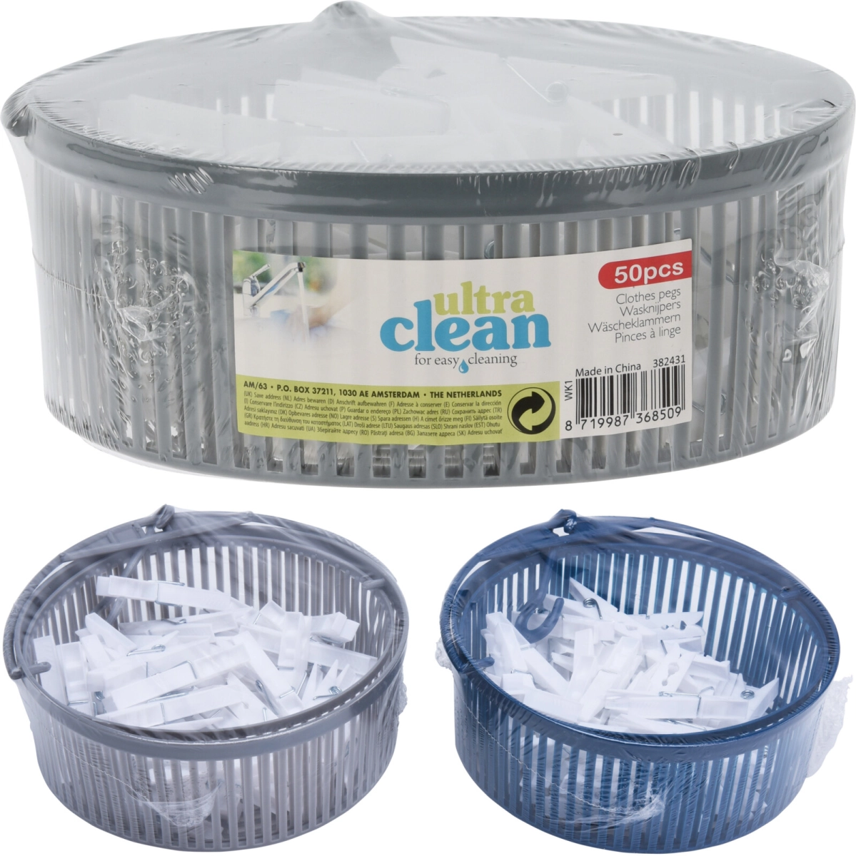 Handig mandje met 50 wasknijpers. Aan het mandje zit een haakje waarmee u het mandje op kunt hangen aan bijvoorbeeld de waslijn.
